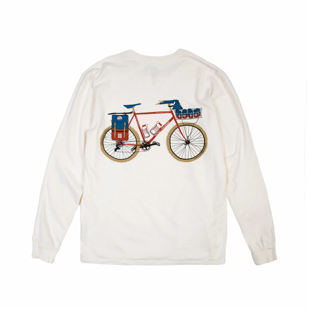 Plan your next bikepacking trip (or just daydream about it) with our bike-inspired Graphic Tee. Illustrated here in town by Topo Designs graphics team, this custom long sleeve 100% organic cotton tee is built with the love for all things bikes in mind.