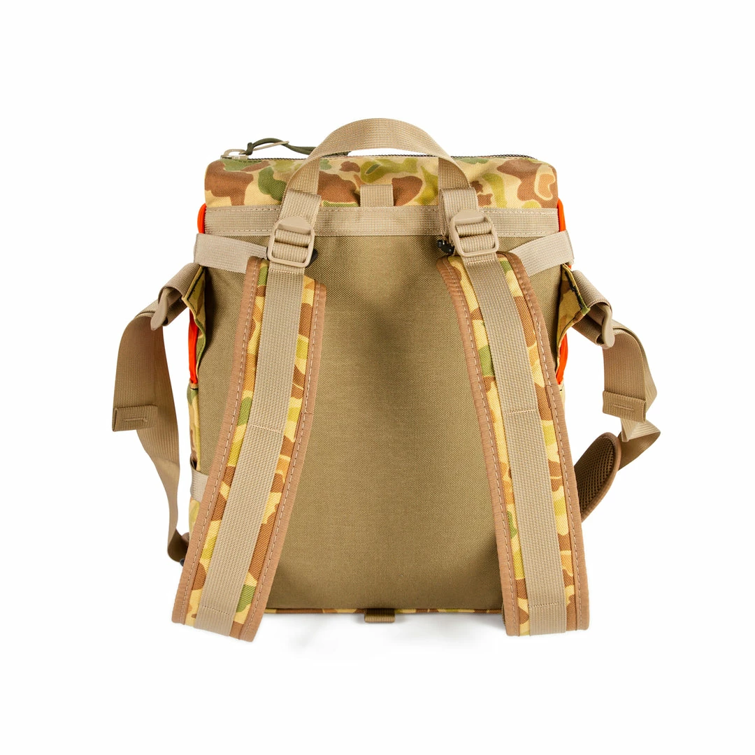 The Rover Shoulder Pack incorporates Natal 1000D outer camouflage nylon with a 400D blaze orange interior pack cloth. Built with YKK zippers, coyote brown webbing, a branded leather patch, and internal laptop sleeve (fits up to 15″).