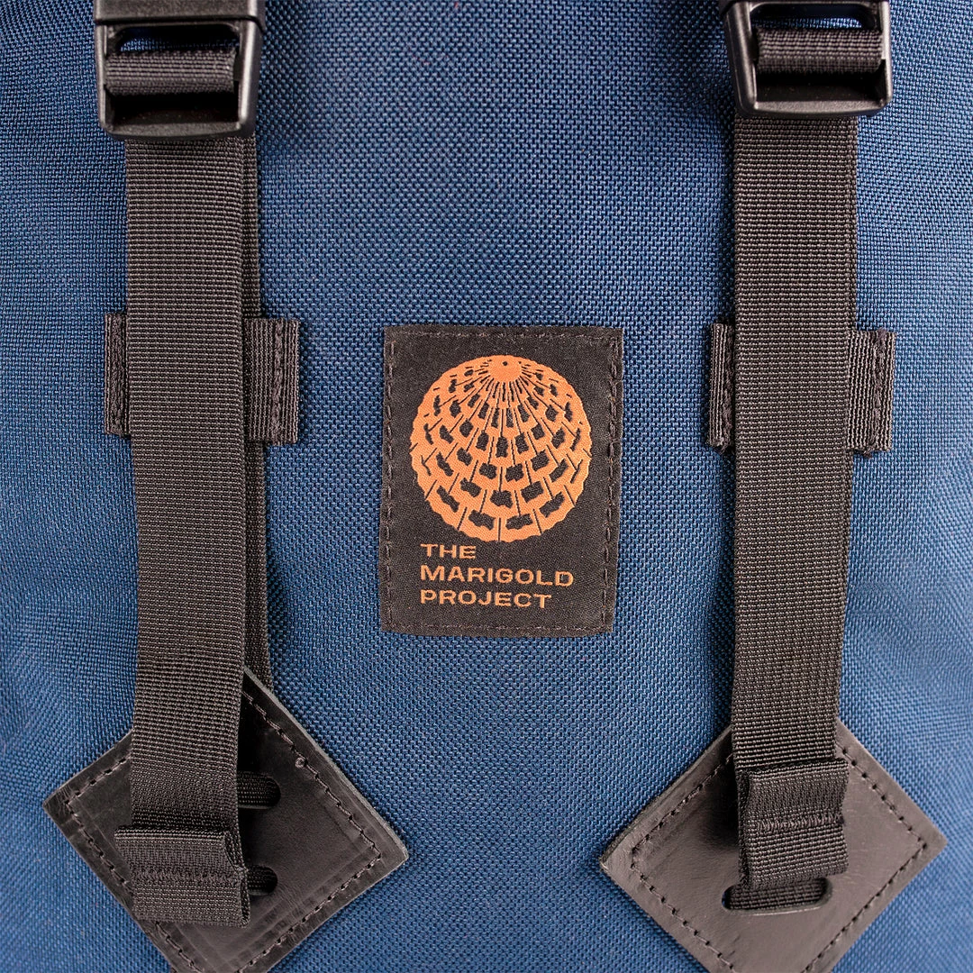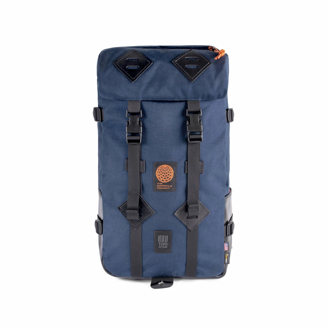 The Topo Designs x Nathaniel Rateliff & The Night Sweats Klettersack is built from navy 1000D Cordura® and black Horween® leather, then finished with a woven Marigold Project label.