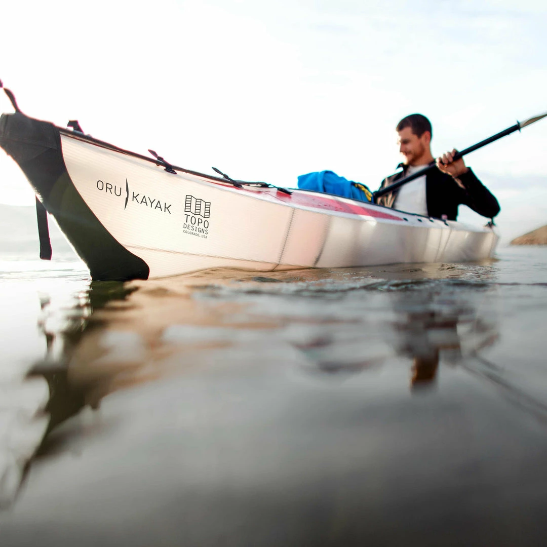 The Topo Designs X Oru Kayak collaboration package includes the Beach LT model kayak (paddle included), featuring Topo Designs inspired top graphics, custom blacked-out bulkheads and base plate.